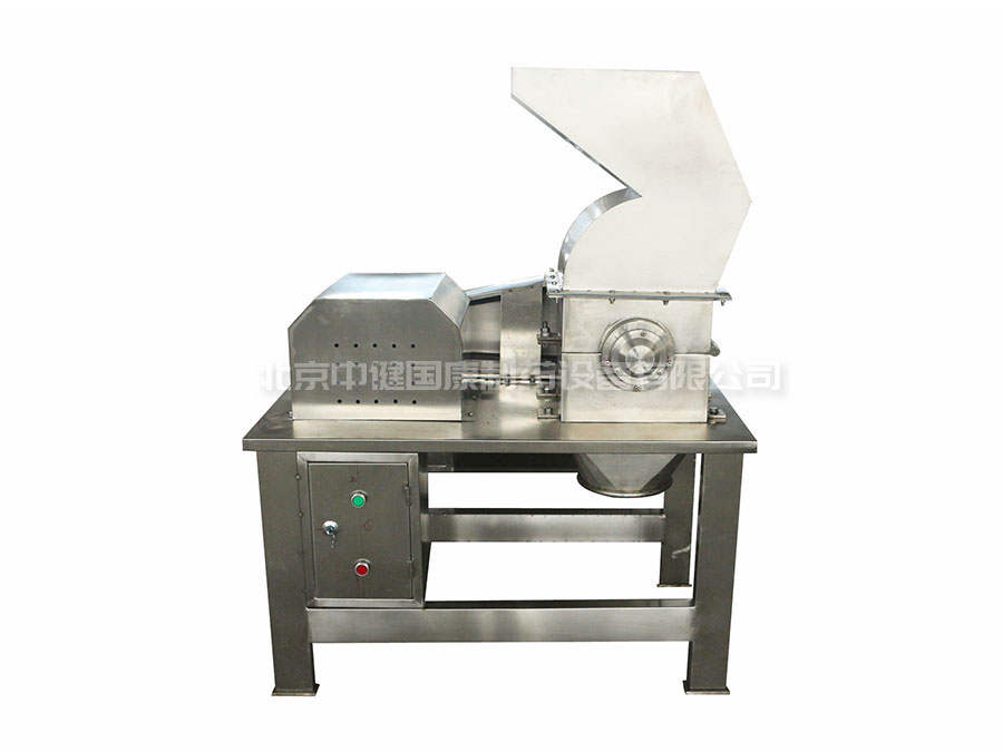 該機(jī)由機(jī)架、電機(jī)、進(jìn)料斗和粉碎機(jī)構(gòu)四個(gè)部件組成,物料經(jīng)進(jìn)料斗直接進(jìn)入粉碎室,經(jīng)中速旋轉(zhuǎn)的動(dòng)刀與定刀的強(qiáng)力剪切達(dá)到粉碎的目的。通過調(diào)節(jié)動(dòng)刀與定刀的間隙,控制所得顆粒的大小。通過篩網(wǎng)的控制將達(dá)到要求的顆粒從出料口排出,而未達(dá)到要求的物料在粉碎室內(nèi)繼續(xù)剪切粉碎,直至達(dá)到要求。